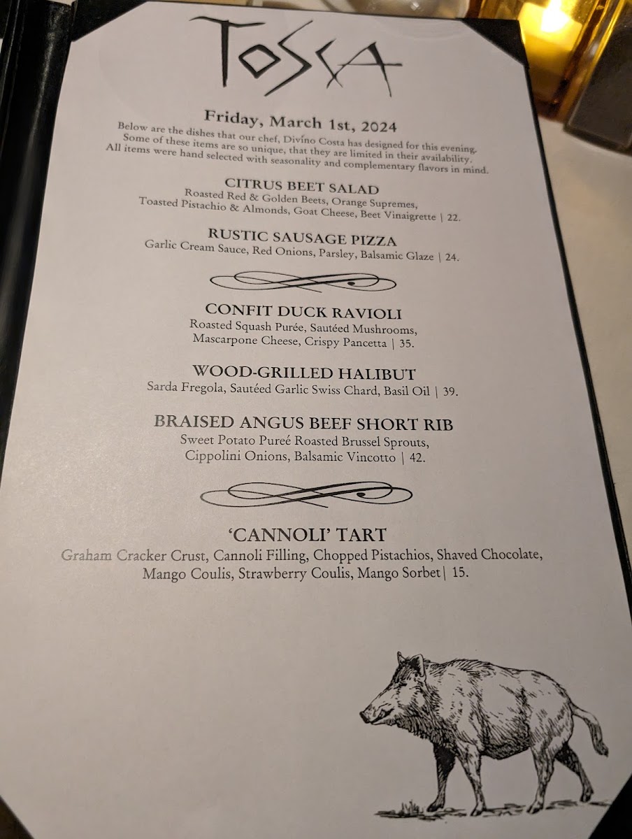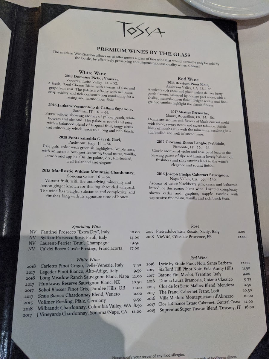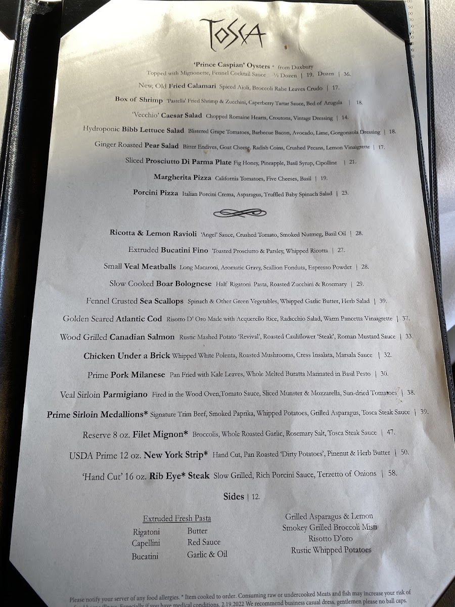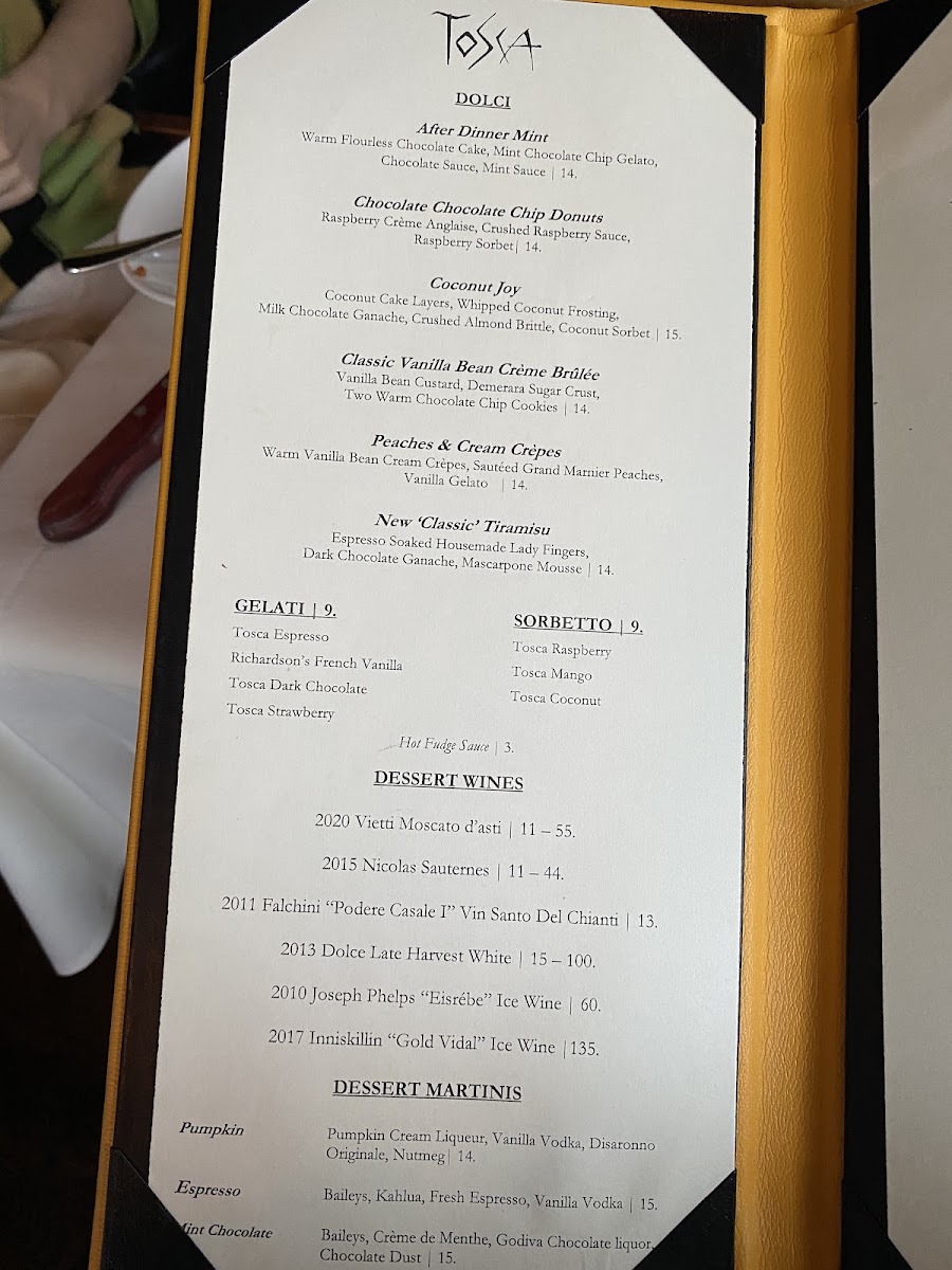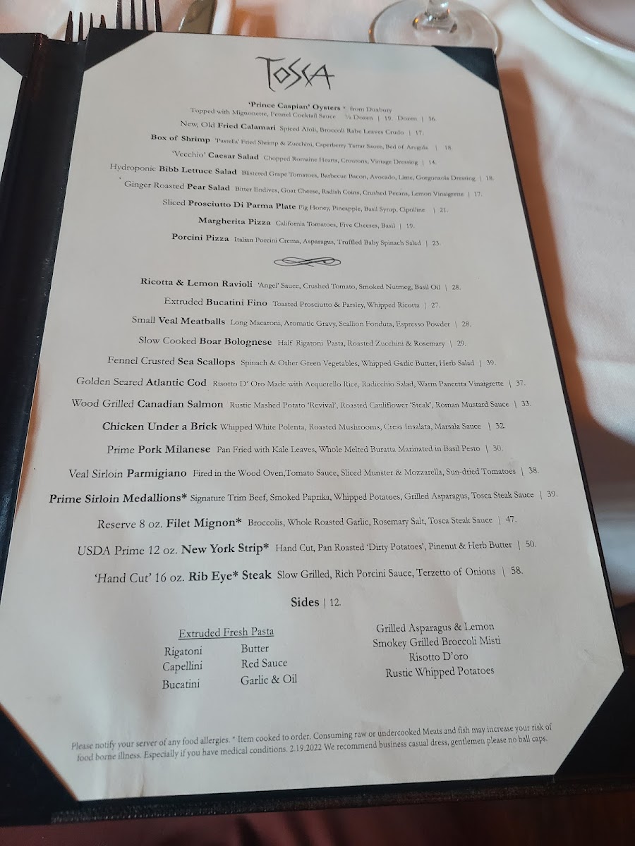 The atmosphere is inviting, with a lovely natural beam decor that adds to the charm, enhanced by a thoughtful wine selection tailored for every palate. While the energy can be lively, it’s the attention to detail and the warmth of the staff that truly sets Tosca apart. Many diners have shared unforgettable experiences, highlighting the personalized service that makes each visit feel special. Whether it’s the scallops or the indulgent cannoli, every dish promises a memorable dining experience.